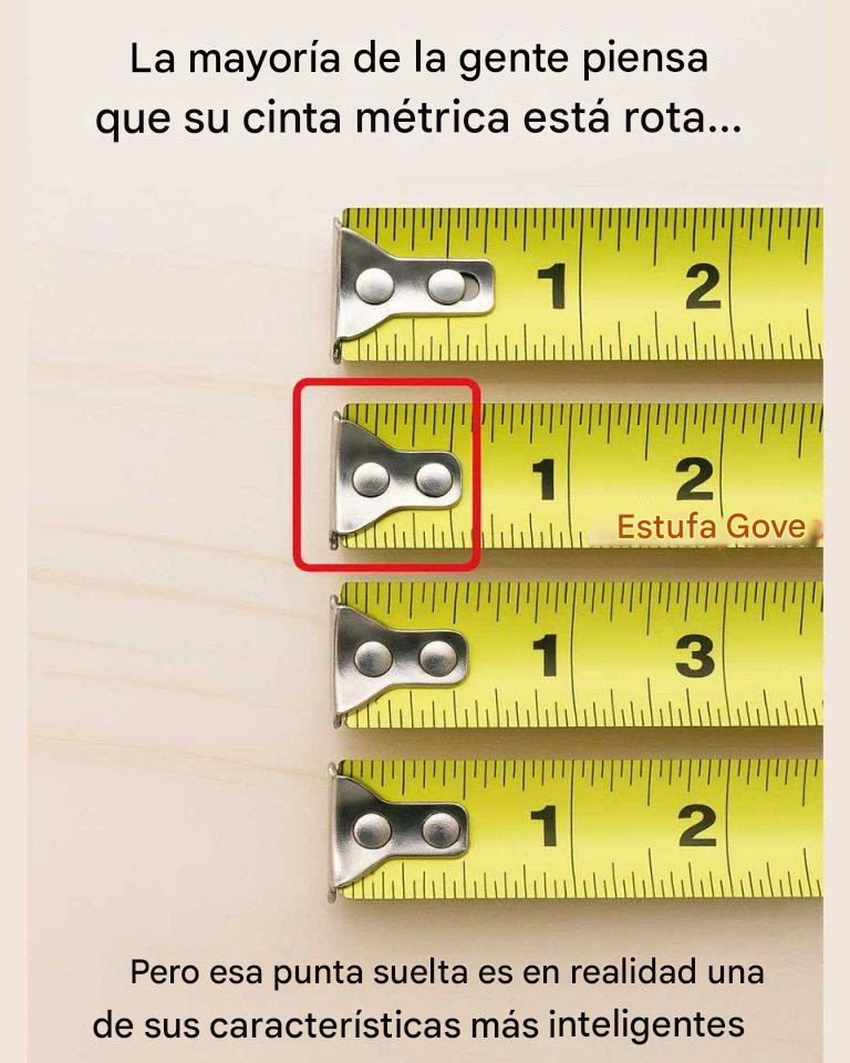 La punta suelta de una cinta métrica está diseñada para tener en cuenta su grosor. Al medir dimensiones exteriores, como la longitud de una mesa, la punta se presiona contra el borde del objeto y el movimiento compensa su grosor. Por el contrario, al medir dimensiones interiores, como el ancho del marco de una ventana, la punta se tira contra el objeto y el movimiento compensa su grosor. Esto garantiza la precisión de la medición en ambos casos.