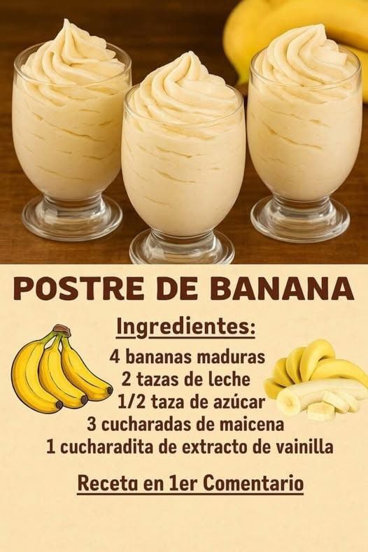 Siiii ! Prepárate para hacer uno de los postres más fáciles, cremosos y sabrositos del planeta: el delicioso POSTRE CREMOSO DE BANANA . ¡Ideal para consentirte sin complicarte! Esta es la receta perfecta para cuando las bananas ya te andan gritando desde el frutero: “¡úsame antes de que me pongan en batido!”